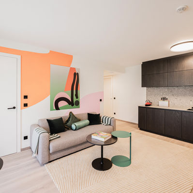 "Our most secluded suite, the Signature Suite "Green" is nestled in a quiet wing with its own terrace surrounded by vineyards and a complete kitchen. It features a separate bedroom and a living room with a sofa that can be transformed into a two-person bed, making it suitable for up to four guests. Ideal for guests who value full privacy and outdoor living."